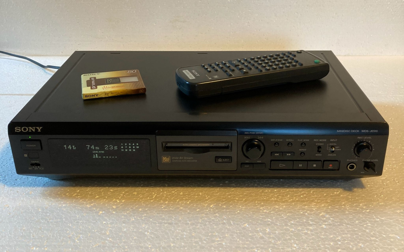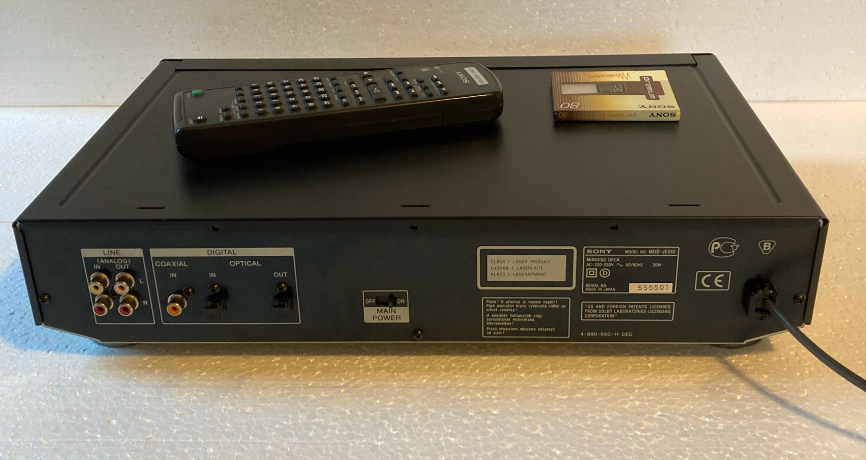 Prodám SONY MDS-JE510 Stereo Minidisc Player-Recorder. Minidisc je skvělý přístroj pro nahrávání a přehrávání zvukových souborů ve vysoké kvalitě používající kódování ATRAC, zajišťující věrnost zvuku CD. Kromě toho můžete vytvořit vlastní tituly skladeb, přesunout, rozdělit a připojit je, kromě mnoha jiných funkcí. Zařízení je v naprostém pořádku a plně funkční. Na pohled nenese téměř žádné známky používání. Původní dálkový ovladač je samozřejmě součástí. Přidávám jedno originálně zabalené 80-min. medium SONY.