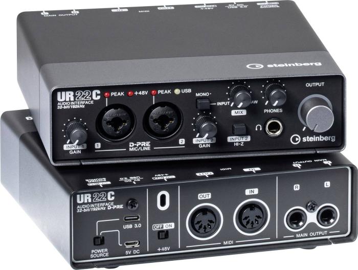 Prodám zvukovou kartu Steinberg UR22C. 2x mikrofonní předzesilovače třídy A D-PRE s fantomovým napájením +48 V. Monitoring bez latence s podporou DSP s reverbem REV-X, channel stripem a klasickými kytarovými zesilovači (také zahrnuty jako pluginy VST 3, AAX a AU). Ovládání mixu monitoru. Mono přepínač 2 kombinované vstupy pro mikrofon / linku: XLR / 6,3 mm jack – přepínač Hi-Z na vstupu 2 pro elektrickou kytaru 2 linkové výstupy: 6,3mm jack, MIDI vstup a výstup, Stereofonní výstup pro sluchátka: 6,3mm jack. Napájení přes USB 3.0 (pro USB 2.0 přidám napájecí zdroj). Robustní kovové pouzdro. Perfektní stav - používáno pouze v domácím studiu. Poslední Firmware. Max. 32bit/192KHz.
