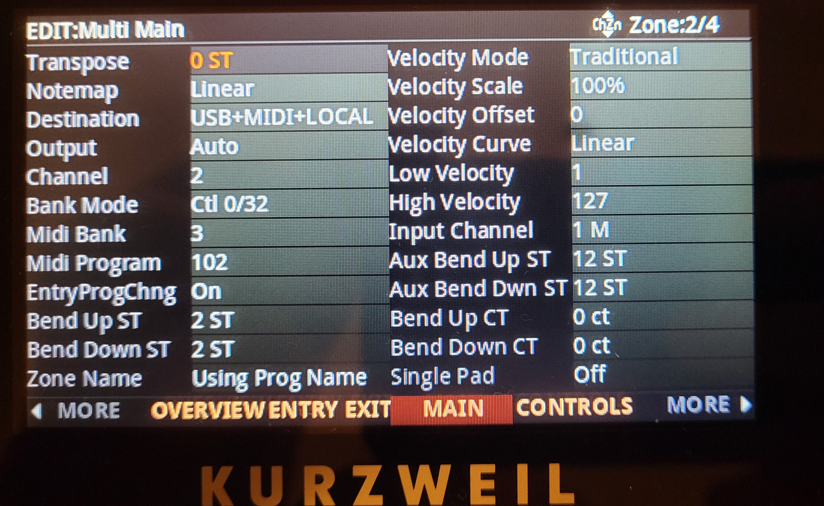 Nie, Kurzweil bude hlavný nástroj. Práveže z neho chcem ovládať aj zóny, ktoré budú hrané na tej externej klaviatúre. Doteraz som mával dva nástroje, kde som mal k dispozícii súčasne viacero zvukov a teraz som sa rozhodol nahradiť ich iba K-čkom a namiesto druhého nástroja mať midi klaviatúru a všetky zvuky ťahať z kurzweilu. Napr. dolu na K-čku budem mať klavír, sláky, alebo hocičo iné a súčasne hore budem mať zapnutý hammond alebo nejaký lead, ktorý by som chcel tiež ovládať expression pedálom, napr. keď potrebujem spraviť fade out, alebo mutnúť zónu druhým switch pedalom či iným prepínačom na kurzweily. Tu midi klaviatúru chcem iba aby som mal viac kláves a teda mohol urobiť viac zón, ktoré sa nebudú prekrývať a všetko to mať uložené v jednom multi.