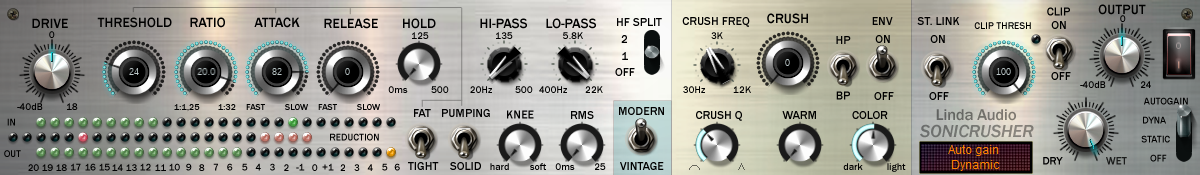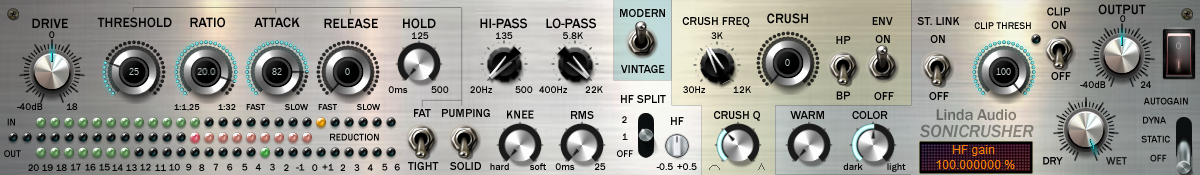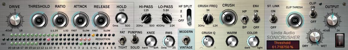HF SPLIT - při zapnutém stavu se kompresor přepne do multiband modu - na dvě pásma, která jsou komprimována zvlášť s různými časy a ratio. Horní pásmo je nastavené lehce nad 10 kHz. 1 a 2 se liší lehce dělicí frekvencí a časy. Na méně výškových signálech to vytáhne výškový hřebínek, na více dynamických výškach to naopak výšky zažehlí. Výsledný efekt závisí i na Thresholdu a jak moc to komprimuje.