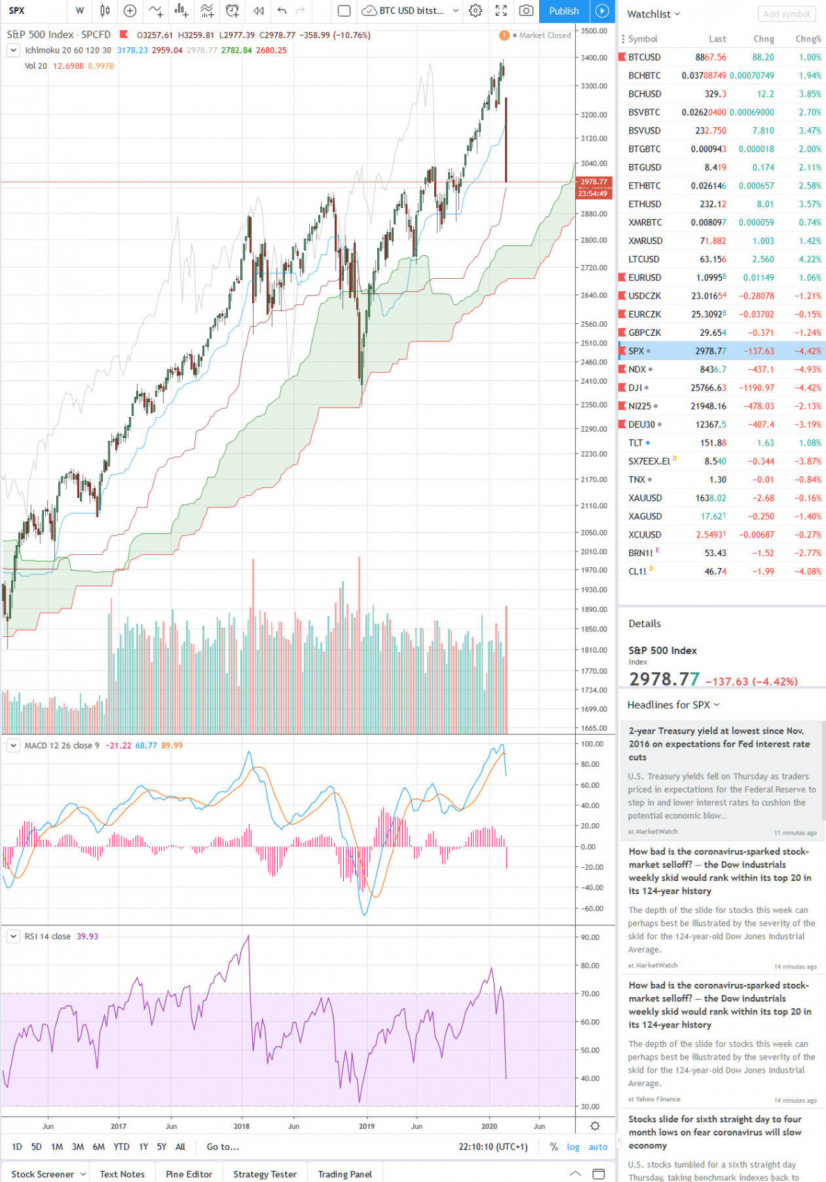 Dnesek je jinak dost armagedon. Ropa otevrela -25% ($32 za barel), vynosy z americkejch vladnich dluhopisu jsou ted -40% (0.42%) proti patku.