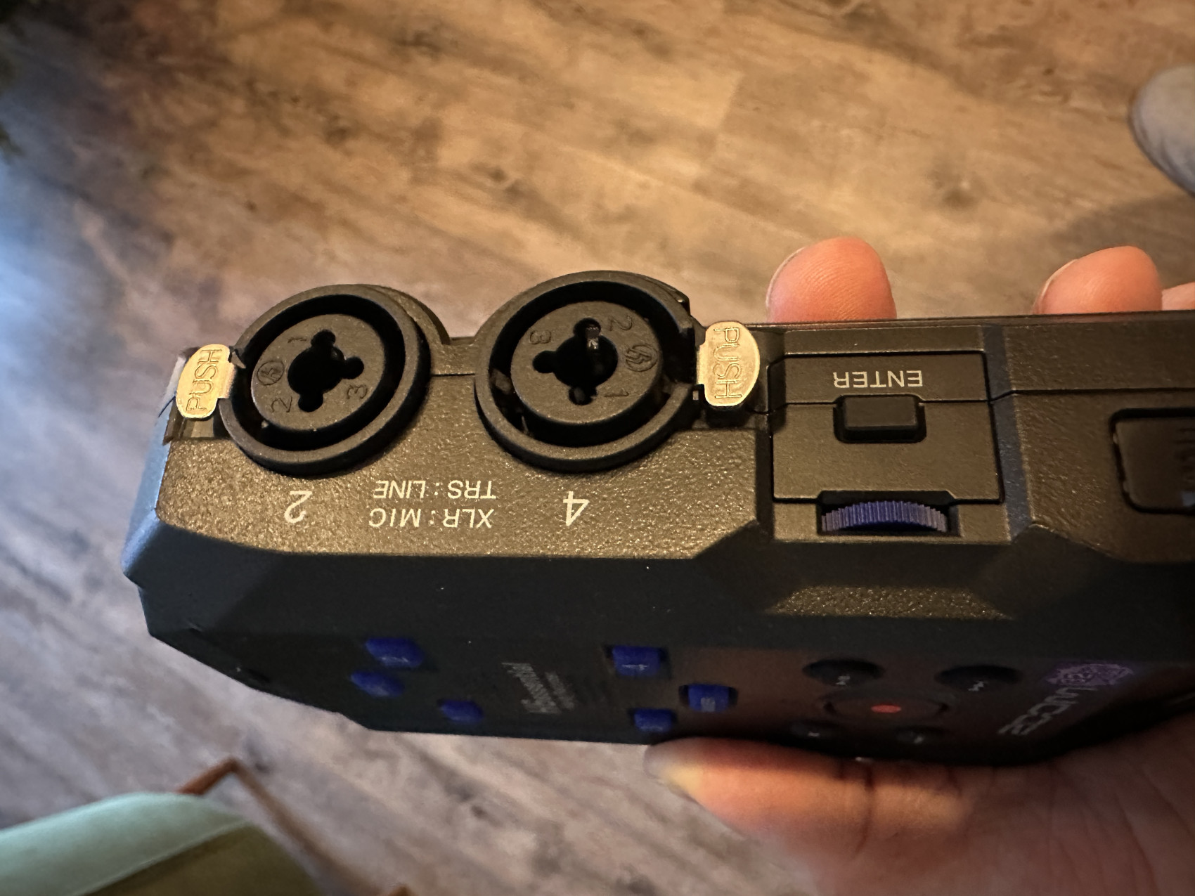 XLR vstupy jsou mikrofonní, přebuzujete je. Z mixu leze linková úroveň; ideální je tedy zapojení do linkovýchg vstupů nebo ještě výrazně víc snížit výstupní úroveň z mixu. Na H6 není indikace úrovně vstupního signálu (alespoň třeba LED nebo tak)?
