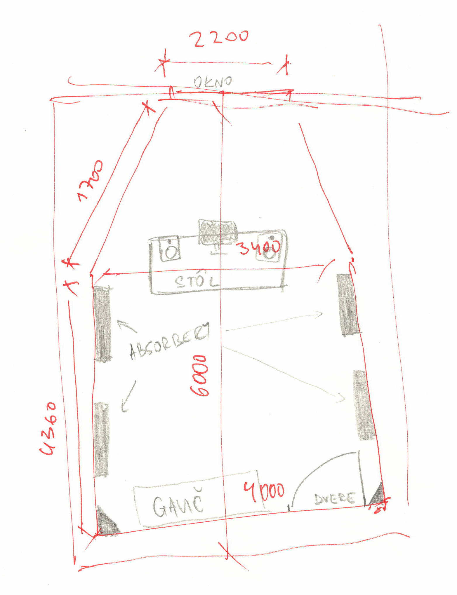vyuzitie miestnosti je réžia, pripajam načrtok s rozmermi... 3x absorber je aj na strope, na stene oproti monitorom (nad gaučom) je dreveny difuzor a na podlahe je velky akusticky koberec...